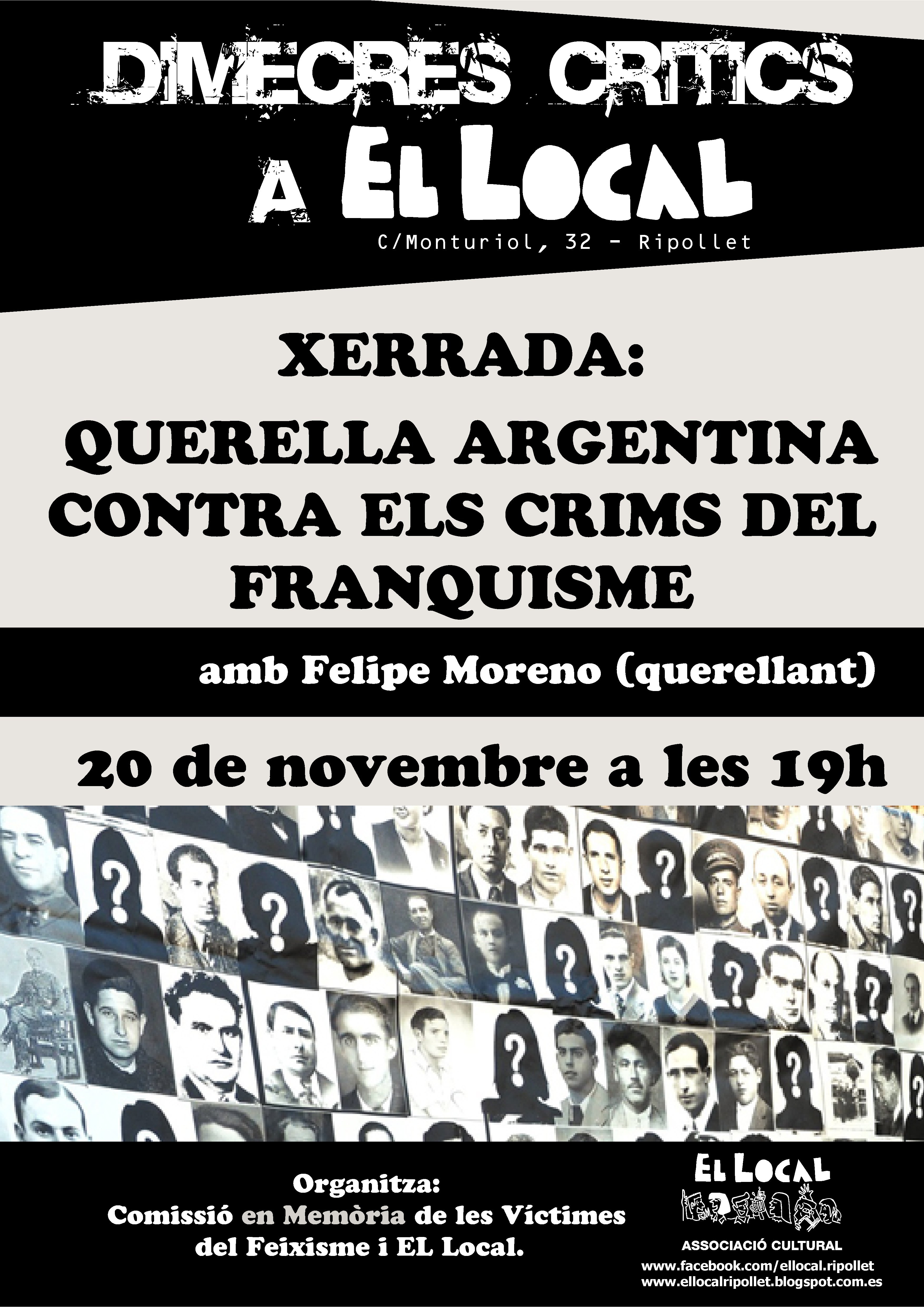 20 de noviembre charla en Ripollet: Querella Argentina contra los crímenes del franquismo DEBATES:Felipe Moreno Publicado por: CeAqua 12 noviembre, 2013 FacebookTwitteremail FacebookTwitteremailTe puede interesar:Agenda Santa Coloma de Gramanet: Recuperem la Memòria Històrica 2015Slepoy: «El govern espanyol s’haurà de posicionar sobre el franquisme»