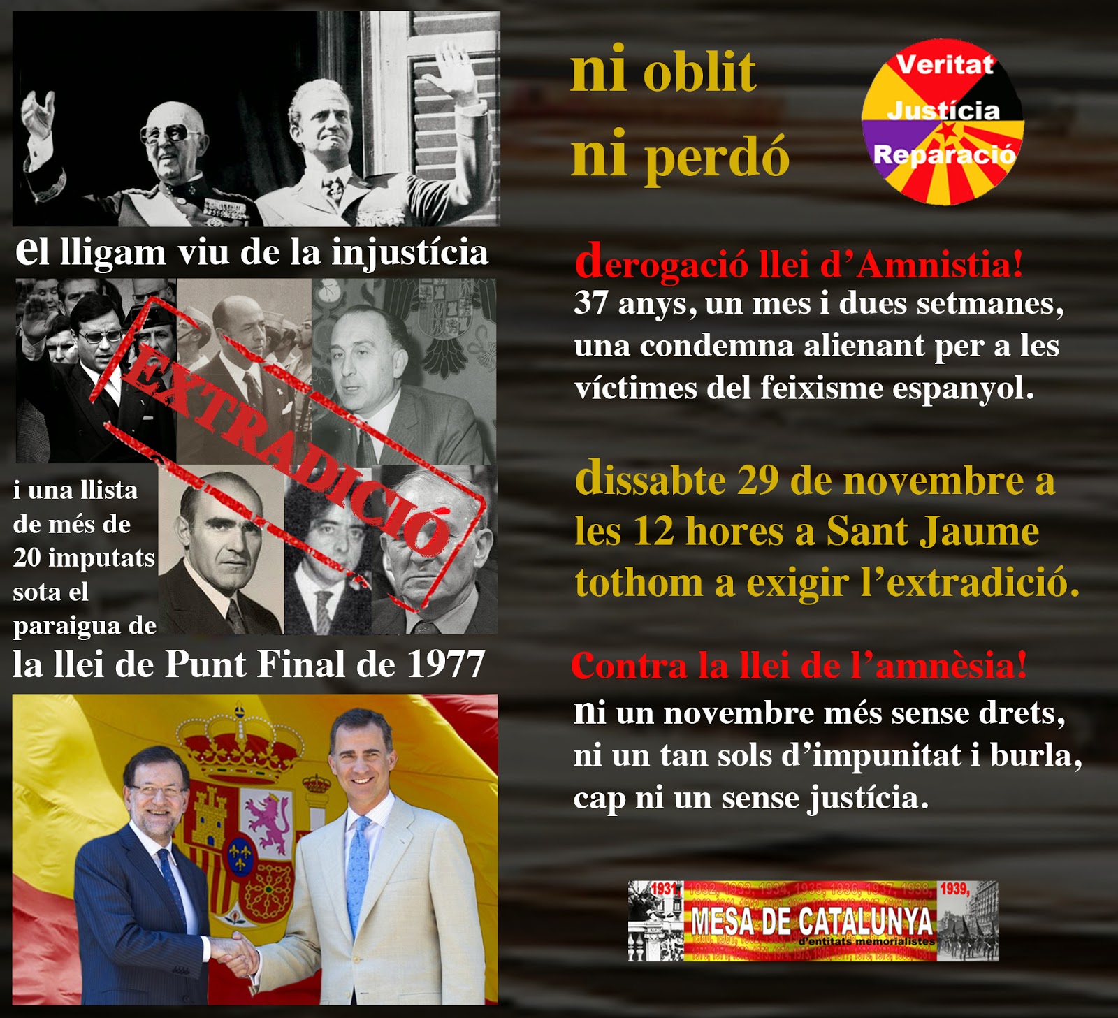 Quan la justícia mira cap altra banda, la dels impresentables constitucionalistes monàrquics, que van soterrar la memòria sota una farsa de reconciliació forçosa i que continuen venent la transició com model d’una Espanya, que cap demòcrata pot acceptar. Quan aquesta figura al·legòrica, que no vol escoltar els nostres crits d’exigència del què en justícia ens pertoca, no ens ha quedat altre remei que buscar en altres ulls més valents i justos, els de la justícia argentina. Ara ja en tenim més de 20 imputats per la jutgessa María Servini, ja tenim ordres internacionals d’extradició, ara ja hem donat un pas molt important, encara que la balança segueixi inclinada del costat dels colpistes, dels rebels a la legalitat republicana, dels assassins. I és així perquè complim una condemna de la qual no hem estat alliberats, 37 anys, un mes i dues setmanes farà el dia de la nostra concentració, el 29 de novembre. 37 anys d’ençà que va ser aprovada la llei d’Amnistia que tantes vegades hem denunciat i de la qual estem fartes de demanar la seva derogació.