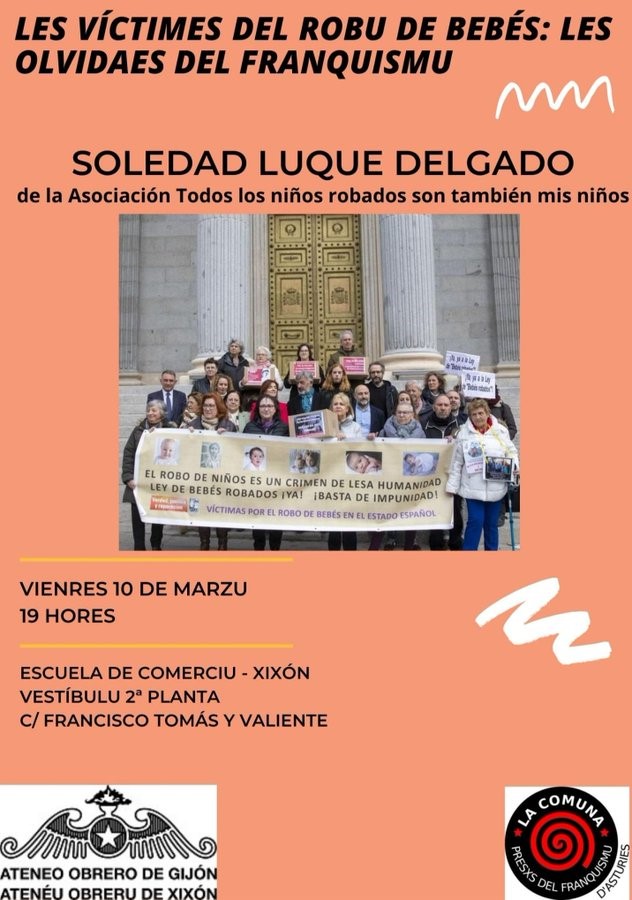 El próximo viernes 10 de marzo se va a realizar una charla sobre el tema de los bebés robados en Xixón organizado por la Comuna d’Asturies a cargo de la compañera Soledad Luque, presidenta de la asociación Todos los niños robados son también mis niños y querellante en la querella argentina contra los crímenes del franquismo por el robo de su hermano Francisco.