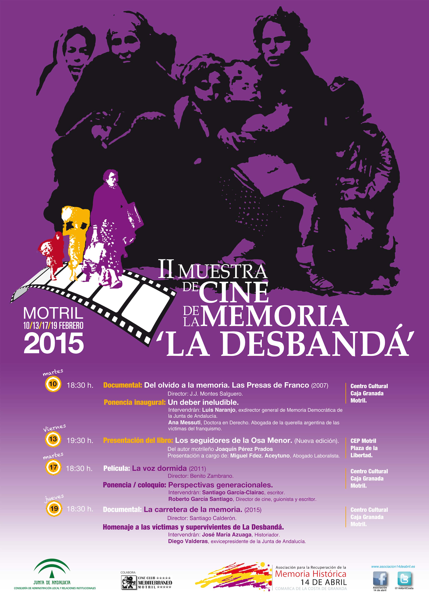 Del olvido a la memoria. Presas de Franco, abrirá la segunda edición de la Muestra de Cine de la Memoria La Desbandá. Este documental, del que Jorge Montes Salguero, subdirector de la Biblioteca Nacional, es el responsable de la dirección histórica, recoge los testimonios de diez mujeres republicanas acerca de su calvario en las cárceles franquistas. Tomasa Cuevas, militante del Partido Comunista de España, que pasó más de seis años su juventud en prisión, recogió los testimonios en una vieja grabadora escondida en su bolso para que no se perdieran en el olvido. La proyección del documental se iniciará a las 18,30 horas del martes, 10 de febrero en la sede del Cine Club Mediterráneo de Motril (Centro Cultural Caja Granada).