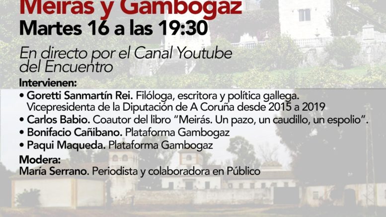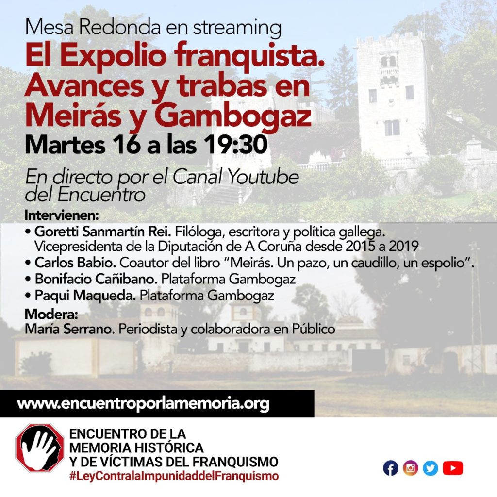 Este martes 16 de marzo a las 19:30 horas, continuamos desde el Encuentro Estatal de Colectivos de Memoria Histórica y de Víctimas del Franquismo (Encuentro), con la serie de mesas redondas sobre la situación de las víctimas del franquismo y de la memoria histórica en el Estado español, dedicando en esta ocasión nuestra charla al expolio franquistas con dos referencias simbólicas importantes: el Pazo de Meirás y el Cortijo Gambogaz.Trataremos los avances y las trabas en estos dos casos y cómo la futura Ley de Memoria Democrática