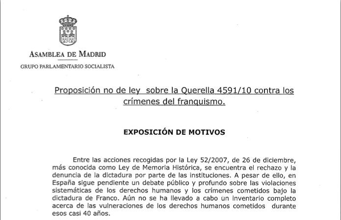 El Partido Socialista de Madrid lo volverá a intentar. El grupo socialista de la Asamblea de la Comunidad de Madrid presentó el pasado 18 de octubre para su debate en el Pleno de la Cámara una nueva Proposición No de Ley para que la cámara de representantes denuncie “la sublevación militar fascista dirigida por el general Francisco Franco”; condene “el régimen dictatorial posterior que durante 40 años reprimió a sangre y fuego todo vestigio de disidencia y lucha por la libertad”; adopte “las medidas necesarias para garantizar a los represaliados y represaliadas por la rebelión franquista y el terrorismo de Estado” su derecho a la verdad; y se adhiera y persone en la llamada querella argentina, que lleva adelante la magistrada argentina María Servini por los crímenes del franquismo.