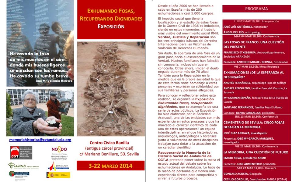 Exposición “Exhumando fosas, recuperando dignidades” DEBATES:ARMHCGTCGT-AFosas Publicado por: CeAqua 22 febrero, 2014 FacebookTwitteremailDel 3 al 22 de marzo en el Centro Cívico Ranilla (antigua cárcel provincial) c/ Mariano Benlliure, 50. Sevilla. FacebookTwitteremailTe puede interesar:Ascensión Mendieta : “Tengo mucha alegría de poder ver un hueso de mi padre para poderme ir tranquila”La ARMH quiere seguir agujereando el olvidoMemoria Democrática y cultura de los DDHH en el Foro por el CambioEl Gobierno cierra filas ante la ONU y recurre a la Ley de Memoria Histórica que dejó sin fondosLugo concede la placa de honor a Darío RivasArgentinos represaliados por el franquismo en AndalucíaDenuncian en Argentina la muerte del antiguo alcalde de O IncioDenuncian en A Coruña 17 casos de desapariciones y torturas en el franquismo.La jueza federal María Romilda Servini de Cubría pidió ayer la exhumación de cadáveres de una fosa común del cementerio de GuadalajaraLa Jueza Servini pide la exhumación de una víctima del franquismo