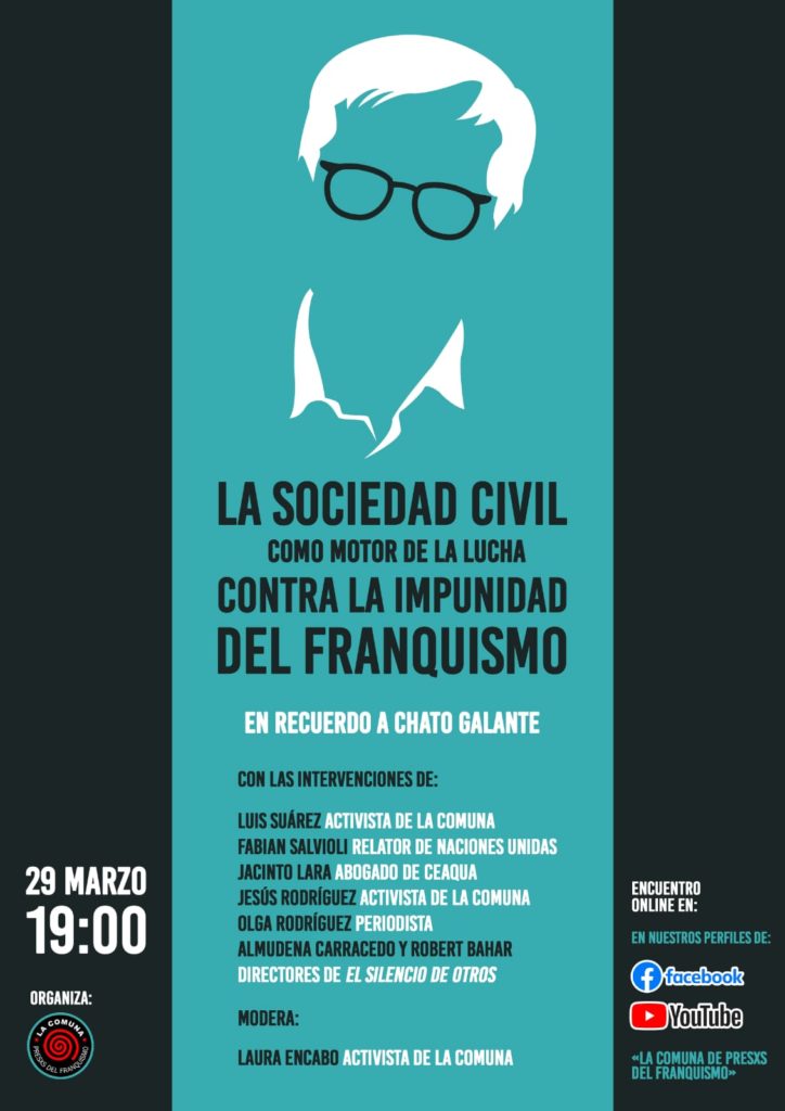 El acto tendrá forma de coloquio telemático y llevará por título La sociedad civil como motor de la lucha contra la impunidad del franquismo. Intervendrán distintos activistas de La Comuna, como Luis Suárez o Jesús Rodríguez, la periodista Olga Rodríguez, el relator de Naciones Unidas Fabián Salvioli, el abogado de la Coordinadora Estatal de Apoyo a la Querella Argentina Jacinto Lara y los directores del premiado documental El silencio de los otros, en el que participó el Chato.