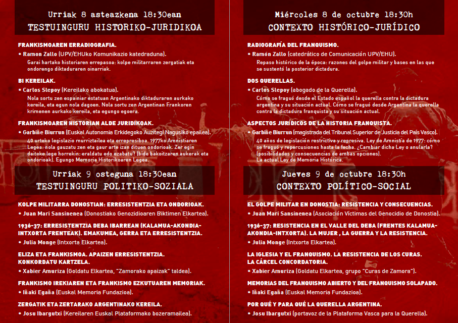 Donostiako Udalak, Giza Eskubideen atalaren bidez, gonbidatu nahi zaitu, Gipuzkoako Foru Aldundiaren laguntzarekin antolatu dituen, “Frankismoaren krimenak” jardunaldietara. Estatu kolpeak ekarri zuen gerran eta frankismoan zehar gertatutakoaren berreskurapenean eta egiaren ezagutzan eta aitortzan, egun oso garrantzitsuak diren ekimenak bizi ditugu. Hauetako bat dugu Argentinako Errepublikako Justizia Auzitegian, 2010. urtetik aurrera eramaten ari den kereila.