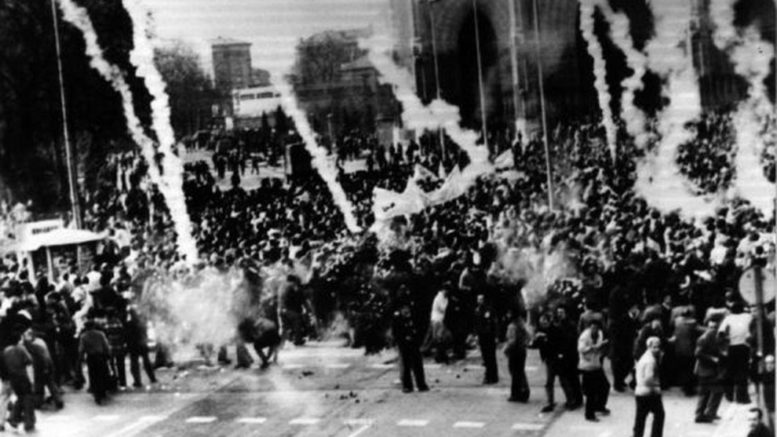 Imagen de las protestas por el primer aniversario de la matanza de Vitoria, producida en 1976. Efe