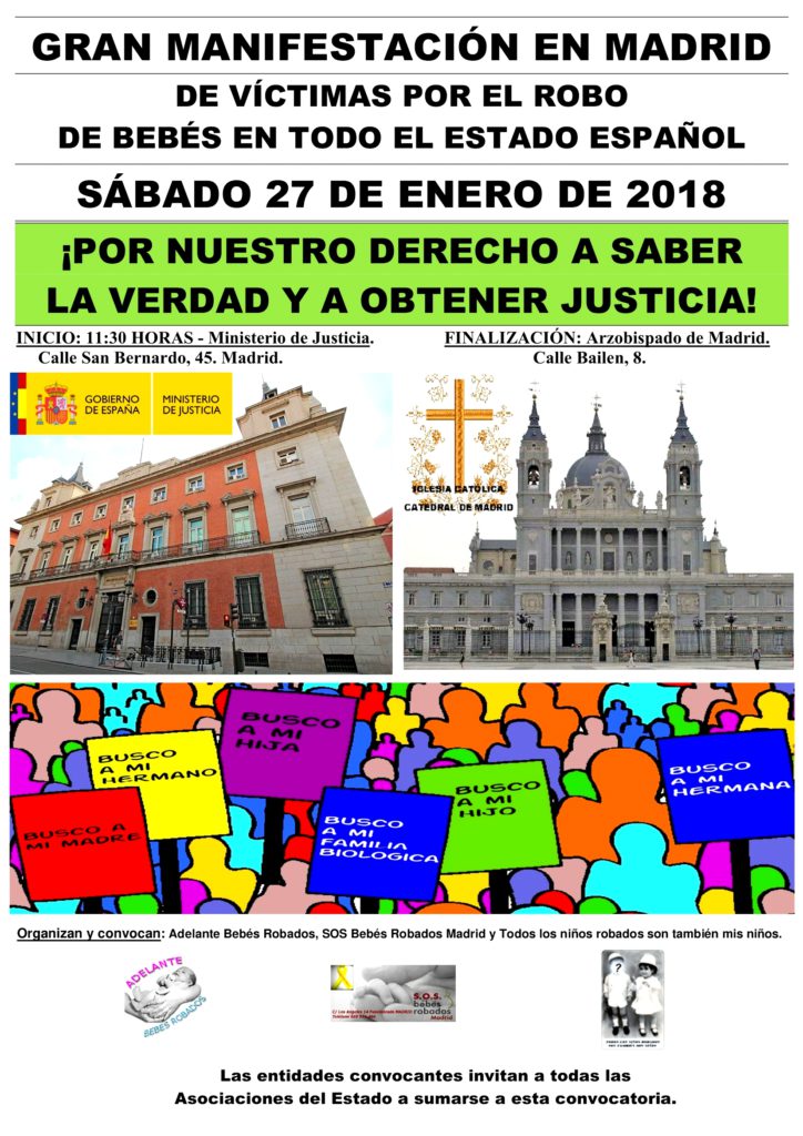 El próximo sábado 27 de enero las víctimas por el robo de bebés celebramos la manifestación estatal en Madrid. Nos encantaría contar con vuestra presencia y apoyo, igual que en otras ocasiones.