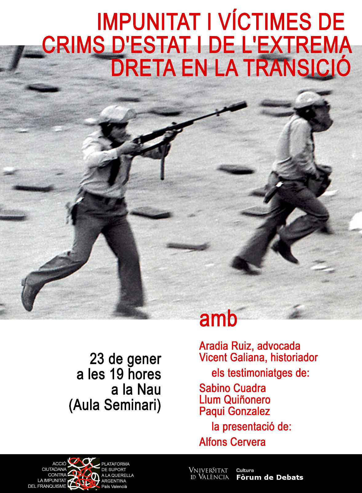 En aquest context, també es farà a La Nau, a les 19 hores del mateix dijous, la taula redona ‘Impunitat i víctimes de crims d’Estat i de l’extrema dreta en la Transició’, que s’emmarca en la programació del Fòrum de Debats del Vicerectorat de Cultura i Esport i tindrà lloc a l’Aula Seminari A, amb entrada lliure fins que es completen les places disponibles. Sobre l’acte de la vesprada obert al públic: http://links.uv.es/dZtWm9p