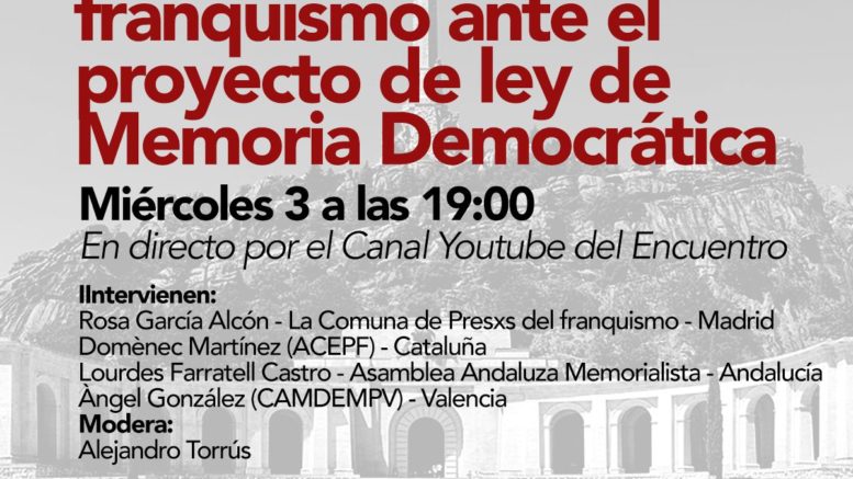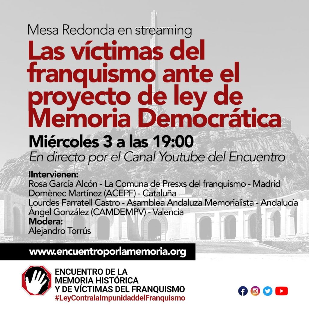 El día 3 se realiza una mesa redonda con la participación de Rosa García Alcón (La Comuna de expresos y expresas del franquismo) para debatir sobre la nueva ley de memoria que se ha presentado por el Gobierno y que próximamente será debatida en el Parlamento.