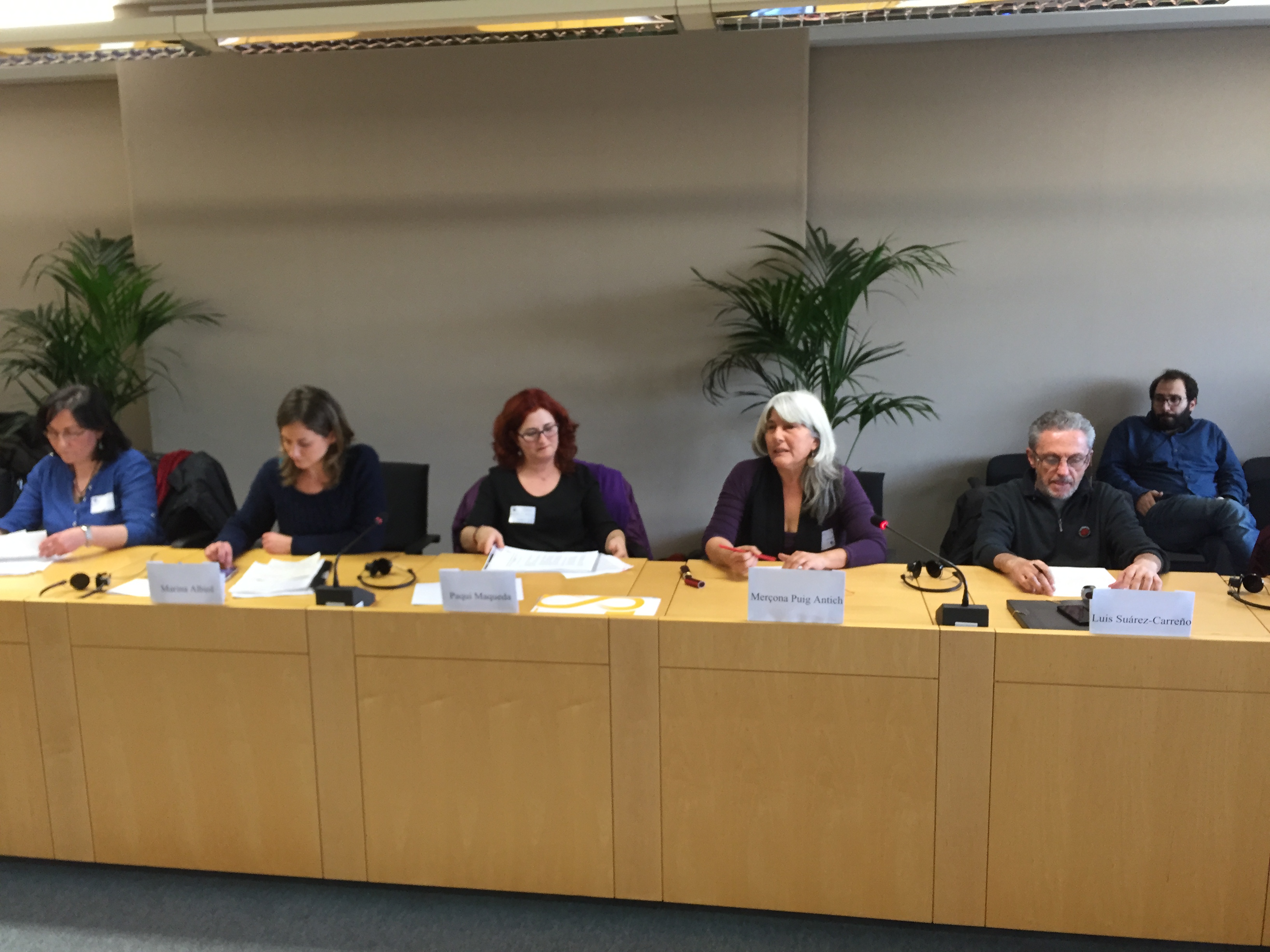 Invitados por la eurodiputada de Izquierda Unida Marina Albiol a un acto que contó con la presencia de Ernest Urtasun (ICV), Josu Juaristi (EH Bildu), Izaskun Bilbao (PNV) o Ernest Maragall (EPDD), la delegación estaba compuesta por decenas representantes de las asociaciones de la Memoria Histórica (como la activista Paqui Maqueda), de colectivos de represaliados durante la posguerra (como los de los sucesos de Vitoria de 1976) o de afectados por el escándalo de los bebés robados.