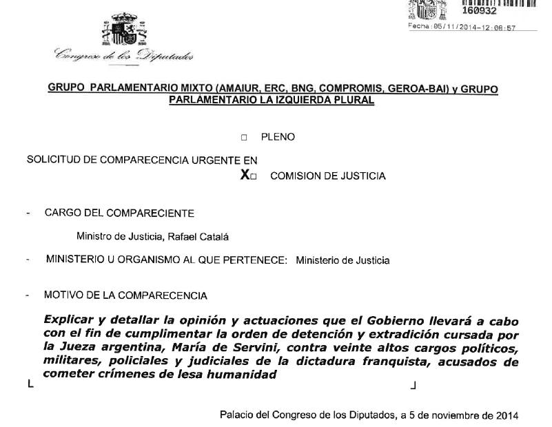 El grupo Parlamentario Mixto y La Izquierda Plural, ha solicitado la comparecencia del ministro de Justicia, Rafael Catalá, para que explique las actuaciones que el Gobierno de Rajoy llevará a cabo con el fin de cumplimentar la orden de detención y extradición cursada por la juez argentina, contra veinte altos cargos políticos, militares, policiales y judiciales de la dictadura franquista, acusados todos ellos, de cometer crímenes de lesa humanidad.