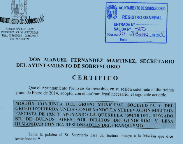 Desde el mes de abril de este año, fecha en la que se organizó La Comuna d’Asturies, el grupo asturiano de apoyo a la Querella Argentina que forma parte de CeAQUA, ya son 17 los concejos que han aprobado en pleno una moción condenando los crímenes del franquismo y apoyando la iniciativa judicial organizada en Argentina para acabar con la impunidad del régimen de Franco.